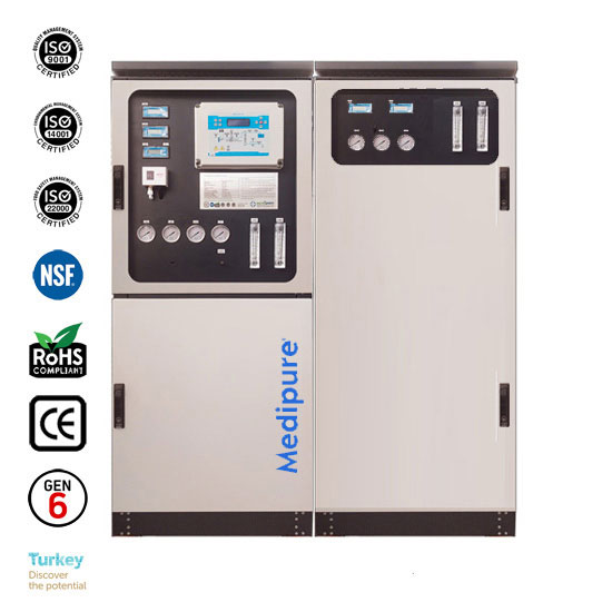 • Medipure XC-9750 Mobil Ultra Saf Su Cihazı; Mikro filtreleme, Karbon Filtreleme, Ozmotik demineralizasyon , Quadplex deiyonizasyon, High Boost ,Direct Flow, Auto Flushing, PLC AI ve 254 nm UV ışın gücü, Çift katmanlı saflaştırma Ultra filtreleme gibi opsiyonel özellikleri tek cihazda barındıran (ALL IN ONE) Dünya' nın ilk ve tek 6. nesil ultra saf su cihazıdır. Her türlü ortam şartında ve koşulda şebeke suyu değeri üzerinden %99,99 performans sağladığı, endüstri uygulamaları, medikal ve klinik uygulamalar ile üretim tesislerinde ispatlanmıştır.